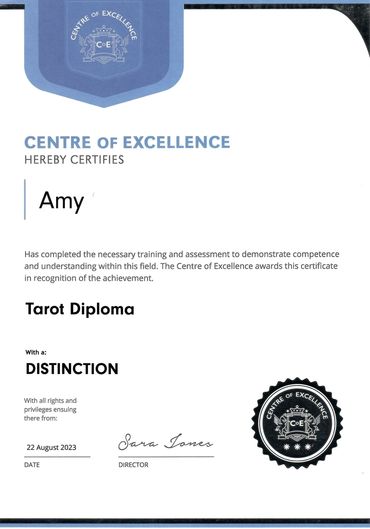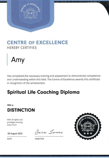 I've studied a lot over the years and gained various qualifications, including angelic healing, along with others. I'm proud to announce that I've earned a distinction in both my Tarot Diploma and Spiritual Life Coaching, alongside other certifications that reflect my dedication to this path (see my certificate page below). These achievements have been a key part of my spiritual journey, helping me strengthen my intuition and gain the tools to guide others more effectively. I'm excited to continue empowering people on their spiritual paths, helping them tap into their inner wisdom and find their true purpose.